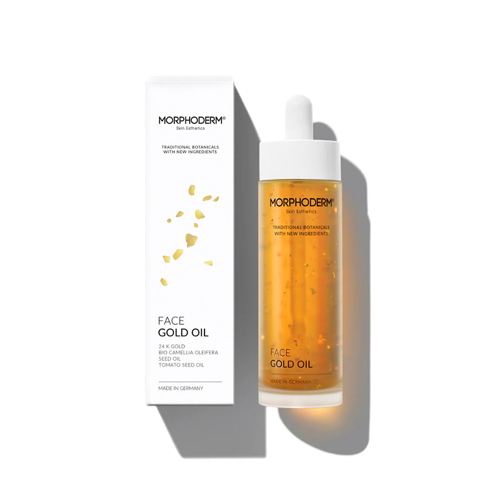 FACE GOLD OIL is a high-quality, new, multifunctional premium facial oil with moisturizing, revitalizing, and soothing properties. It protects the skin from premature aging and oxidative stress. The skin appears smoother, firmer, and radiates vitality and suppleness with a fresh radiance. Wrinkles, unevenness, and blemishes are reduced. A special combination of the finest 24-karat gold flakes and high-quality botanical ingredients such as organic poppy seed oil, organic camellia seed oil, and tomato seed oil unite in this exclusive formula, ensuring a natural, fresh, and well-cared-for appearance. A unique facial oil that combines tradition and innovation. This ultra-light facial oil is completely absorbed by the skin and has a non-greasy texture. Store in a cool, dry place.