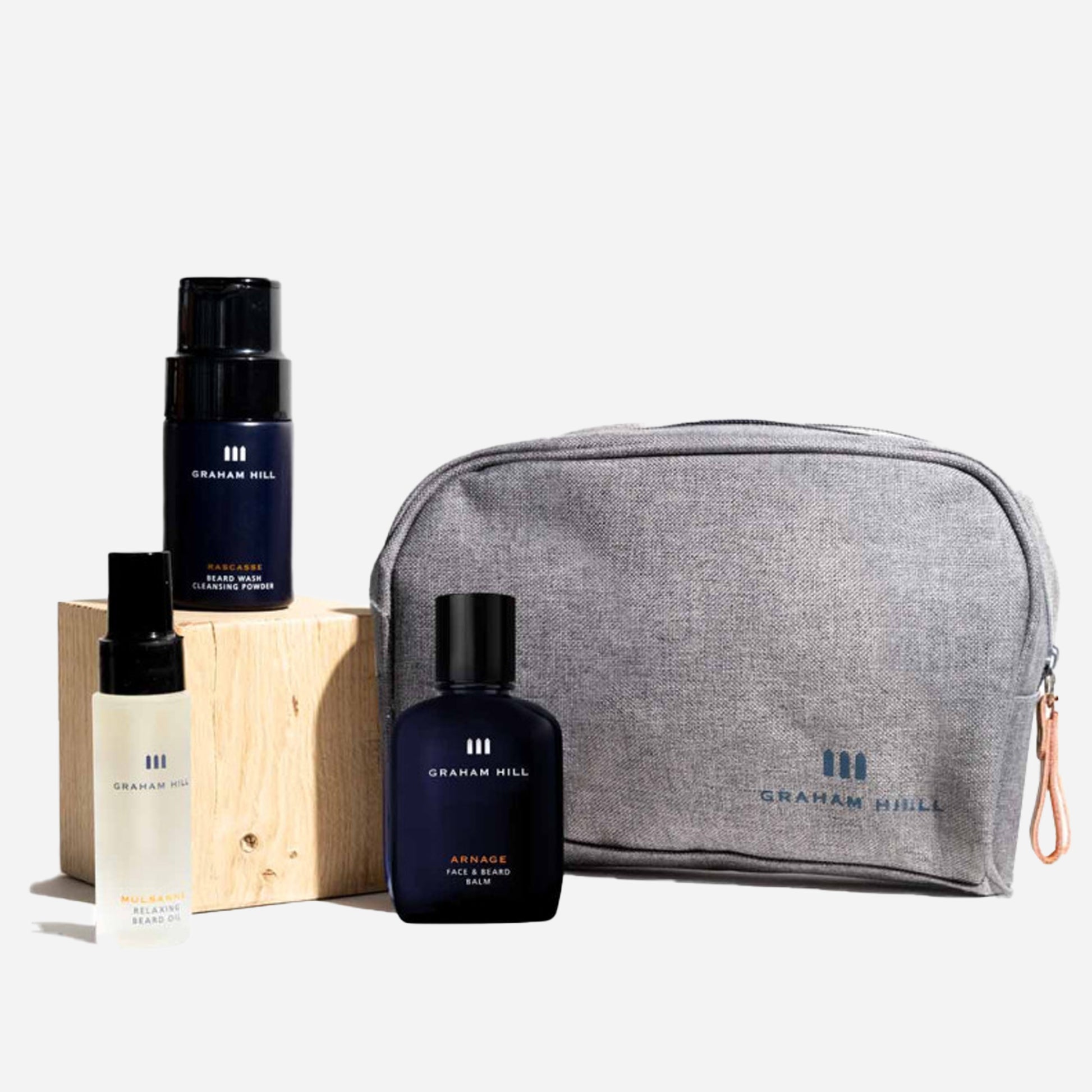 Ergänzt wird das Set durch die GRAHAM HILL COSMETIC BAG, aus hochwertigem Canvas mit praktischen Innentaschen.